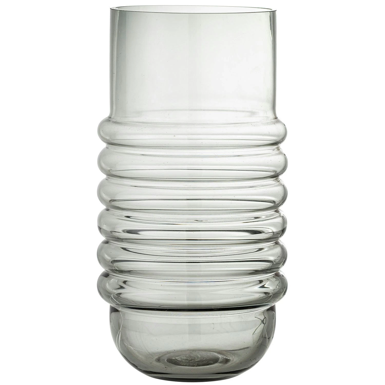 Die Vase von Bloomingville hat ein elegantes Design aus Glas mit einer grauen Schattierung und haptischen, horizontalen Linien fĂŒr ein Design mit dem gewissen Extra. Zeitloser Look perfekt fĂŒr Schnittblumen und Zweige.