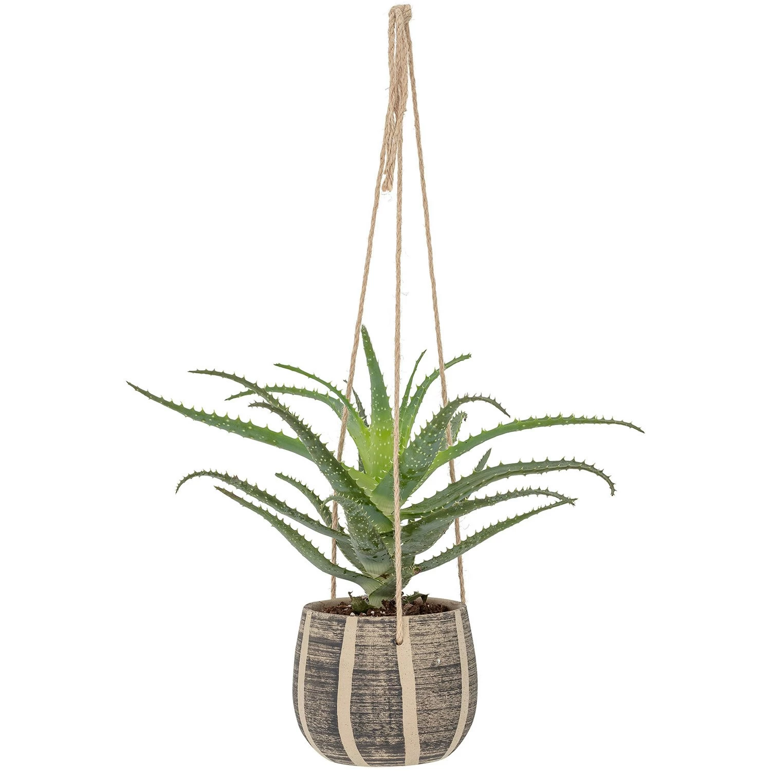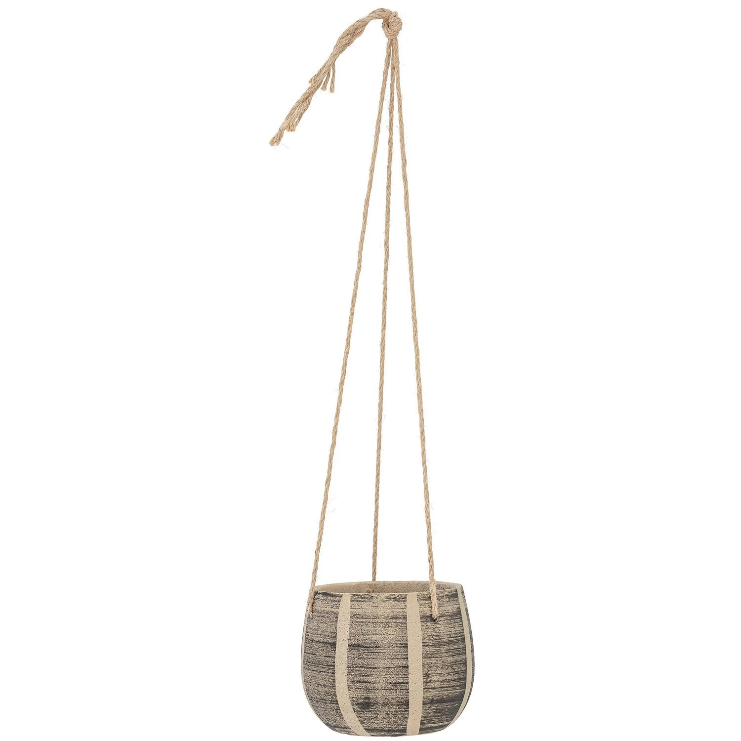 Der Topf von Bloomingville hat ein handgefertigtes, hängendes Design aus Steingut mit drei schönen Kordeln und vertikalen Linien. Er ist glasiert und nur für den Gebrauch in Innenräumen. Jeder Artikel ist einzigartig und kann etwas anders aussehen.